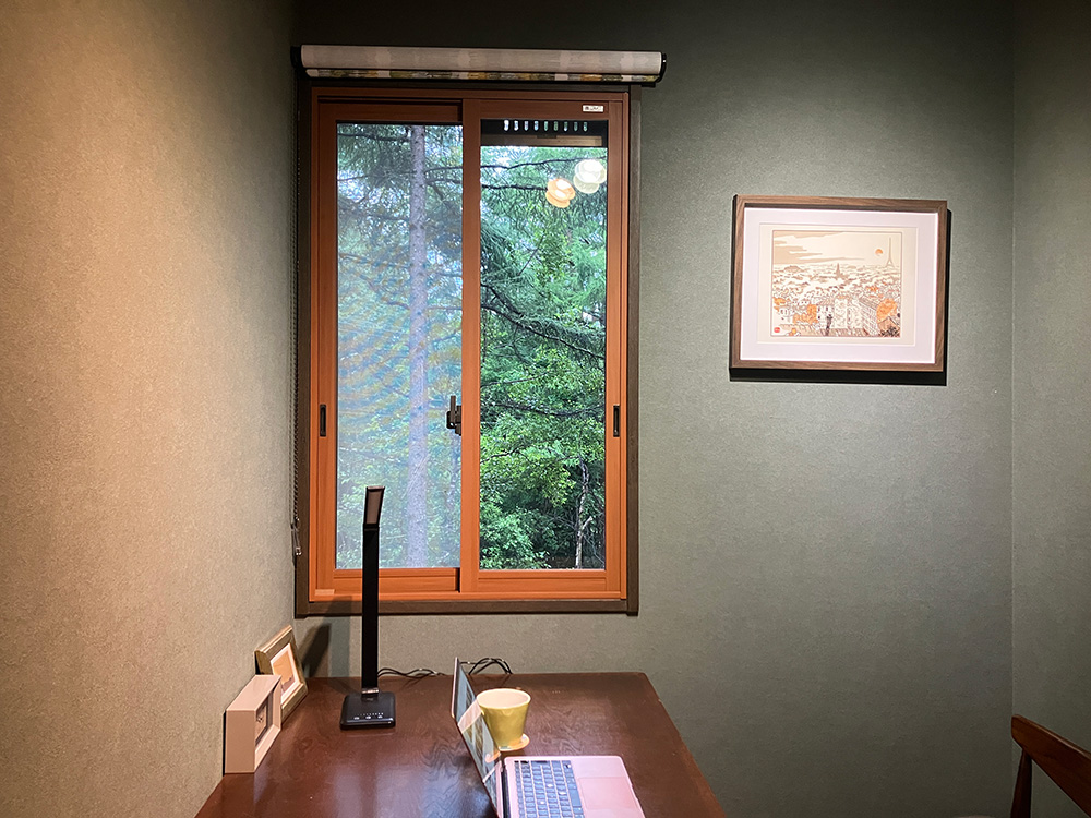 書斎に取り付けた断熱内窓の様子。一段明るい色にしてみました。窓枠でインテリアの雰囲気を変えられるのも楽しいものです。