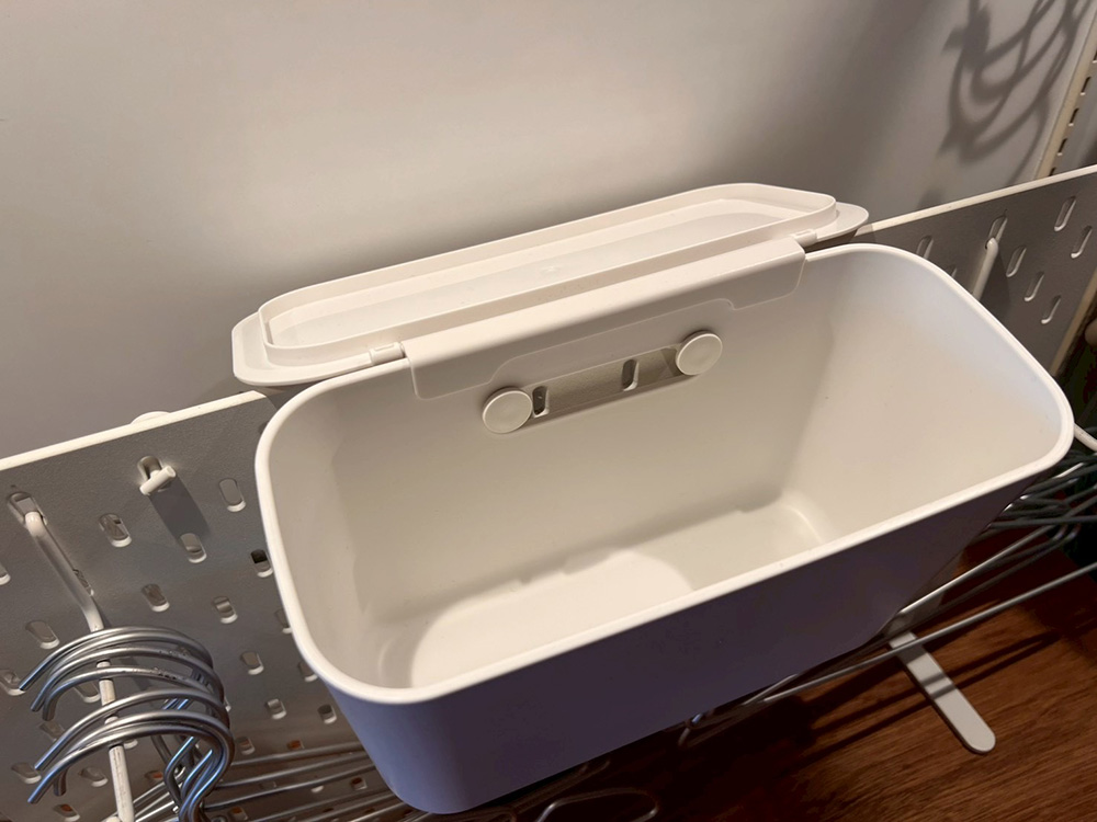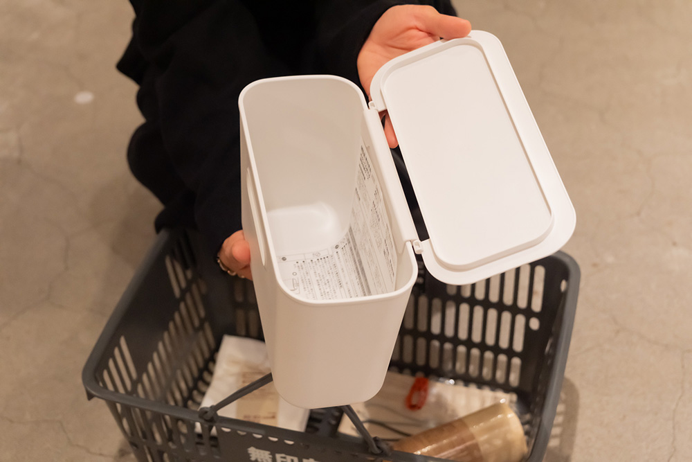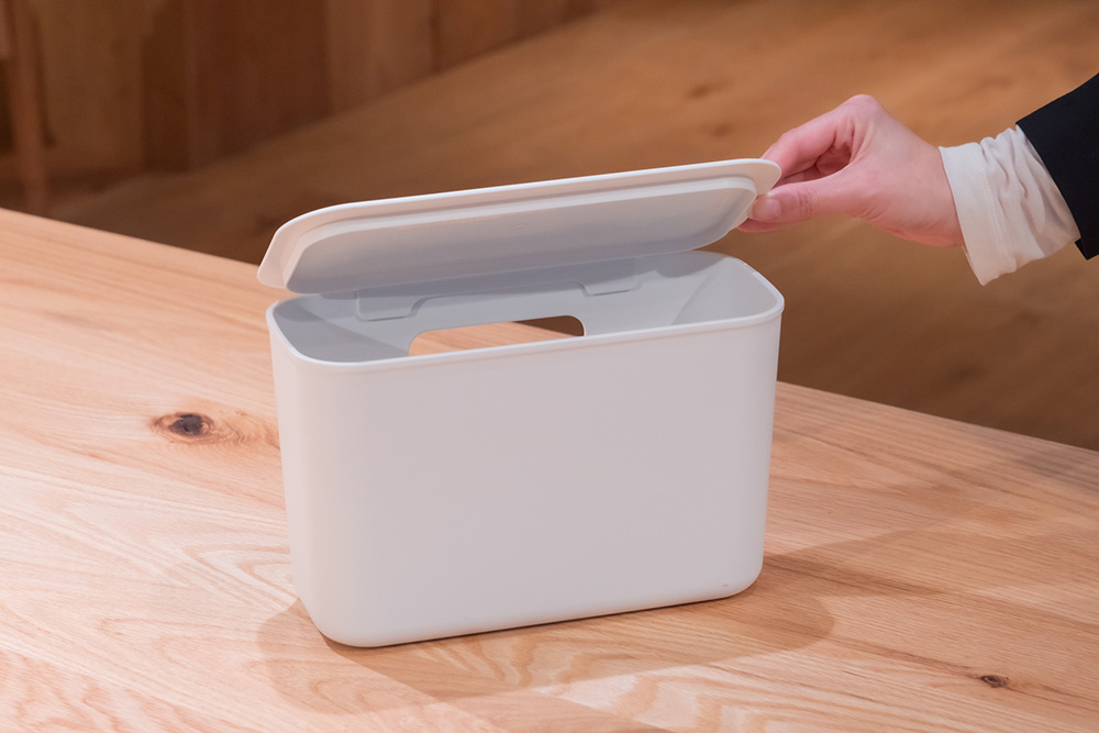 「こういう厚みのないボックスはほかのお店ではあまりありません。薄ければ、場所を取らずにモノの定位置をつくれていいんですよね。しかも、穴があって吊るせる!別売りのふたも付けられる!可能性無限大ですね」