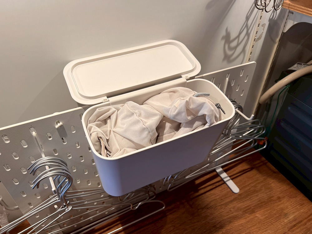 中身は洗濯ネット。フタをしめられるので見た目もスッキリ。そのふたも、開け閉めが楽で収納ストレスなし。ほかのブランドとの組み合わせはメーカー推奨ではないので自己責任ですが、ピッタリフィットすると嬉しい!