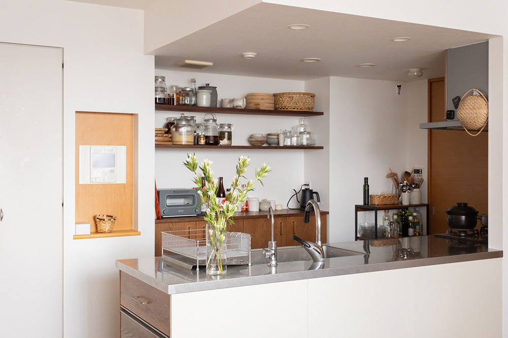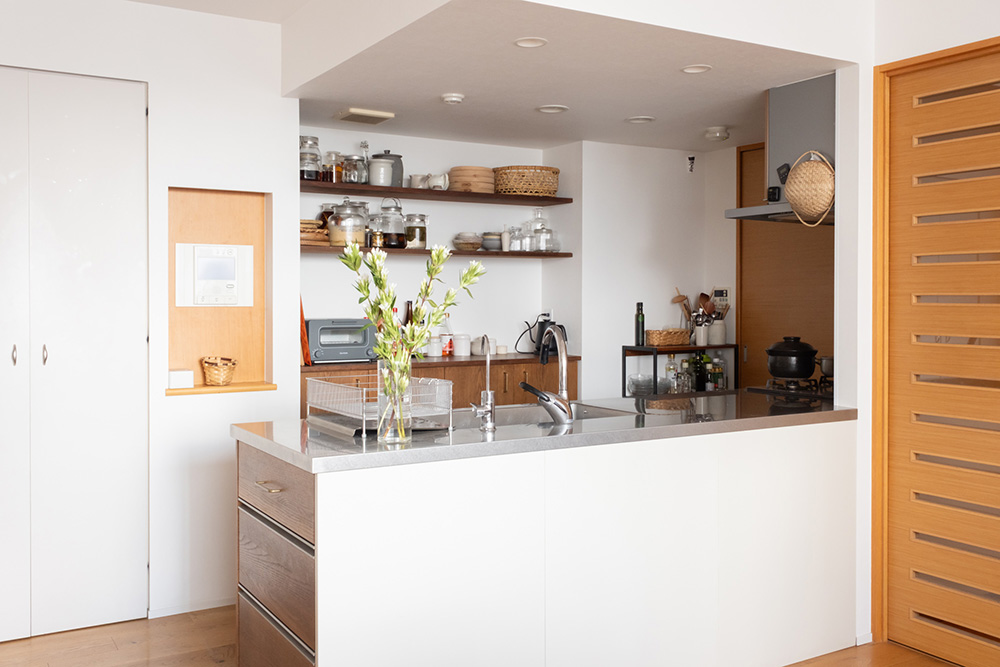 榎本美沙さん(以下榎本):約10年ですね。キッチンのリノベは入居時と、5年ほど前の2回。リノベ前のキッチンは壁に囲まれていてドアもあり、完全に独立していた状態でした。入居したとき、ちょうど料理の仕事を始めた頃だったので、壁を取り払ってオープンにするリノベをしたんです。でも油はねの心配はあったので、10cmの腰壁だけは残しました。