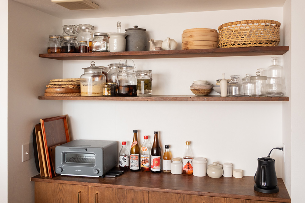榎本:私も忘れちゃうから、あえて目立つところに置いているんです。特に味噌なんかは結構長い間寝かせるんですが、カビが生えていないか定期的にチェックしないといけない。定期的に、といってもタイミングが難しいですよね。だからいつも目につく場所に置くのがいいかなと思って。味噌は冷蔵庫横の作業テーブルとコンロの向かいにある棚に分けて置いています。ちなみにこの棚はかなり長い間使っていて、もう捨てられないですね。奥行きもちょうどぴったりなんですよ。