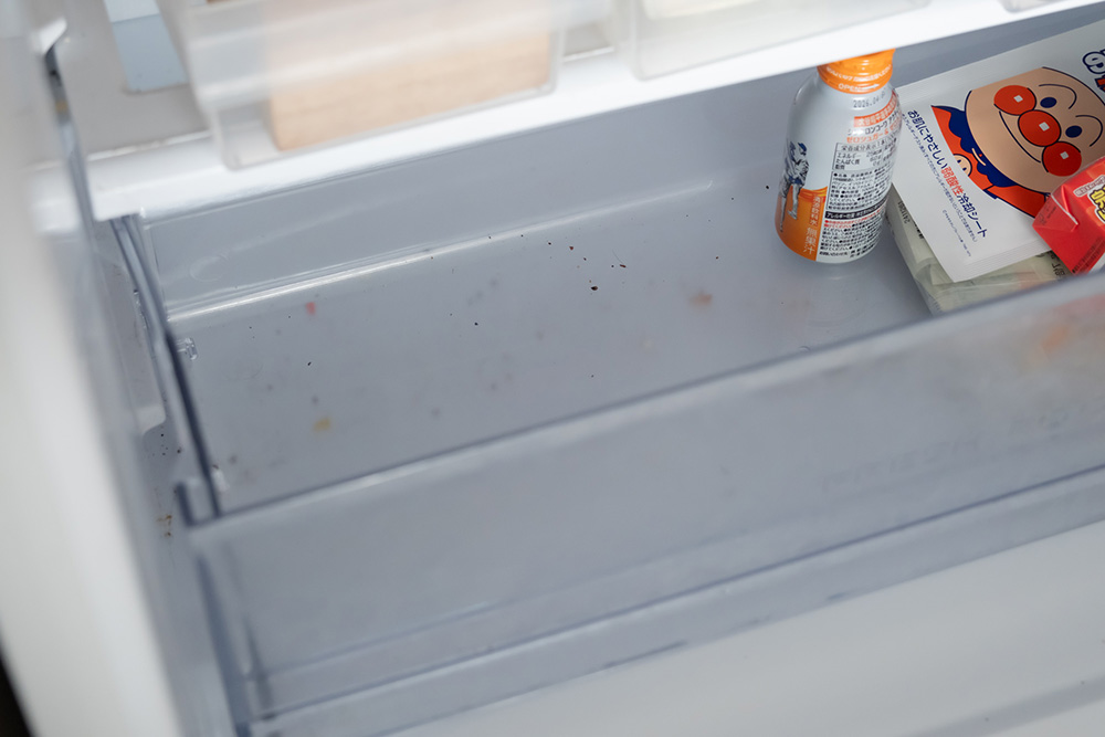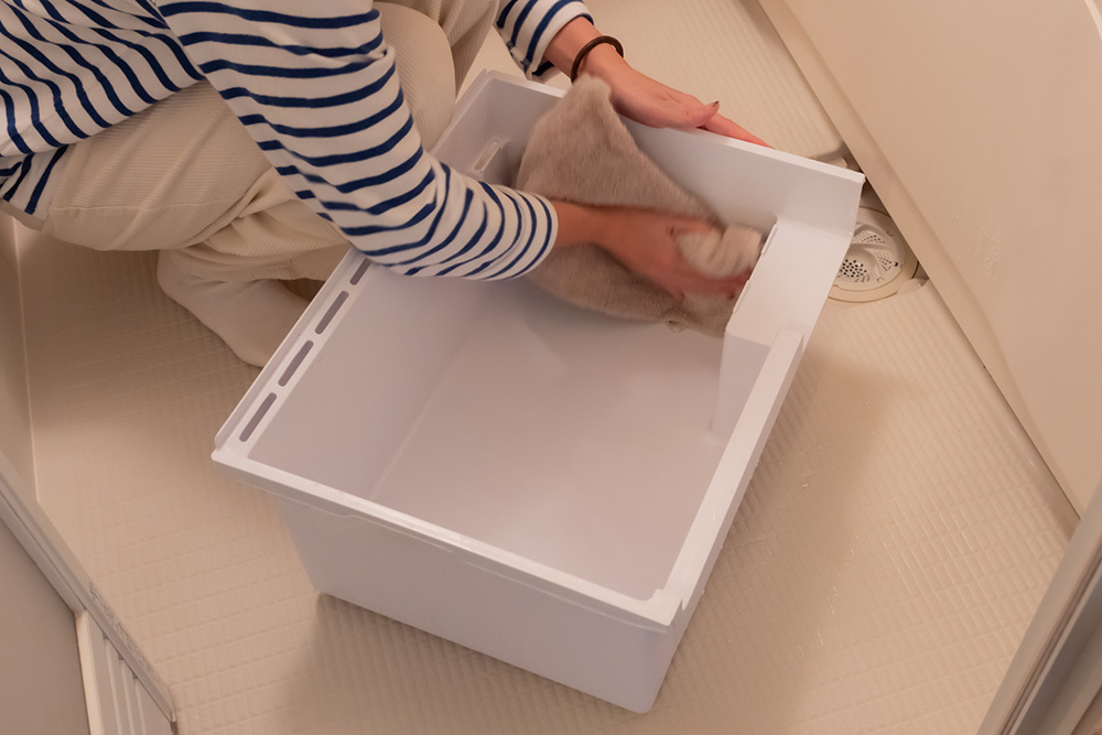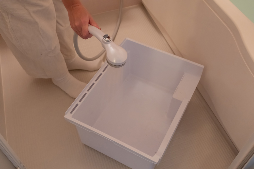 最も効率的なのは、引き出しを外してお風呂場でお湯シャワーを使って洗ってしまう方法です。お風呂場なら広々と、ガシガシと洗えて、汚れもしっかり落とせます。