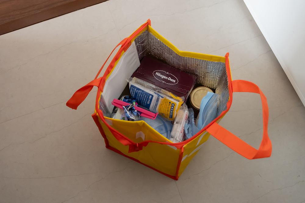 冷凍庫の中身をすべて取り出し、保冷用エコバッグやクーラーボックスに入れて玄関先やベランダなどに一時保管します。賞味期限切れのものや使っていないものを処分する良い機会にもなります。