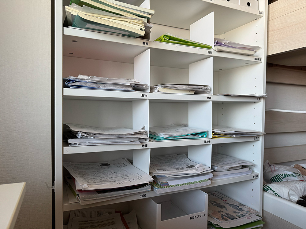 「中学生になったばかりのころは、本人も『ファイリングする』なんて言っていたんですけど、やっぱりできない(笑)。横置きなら、科目別の場所に入れるだけで、順序は整わないにしても、プリントがなくなることはありませんし、取りこぼすということはなくなりました。」