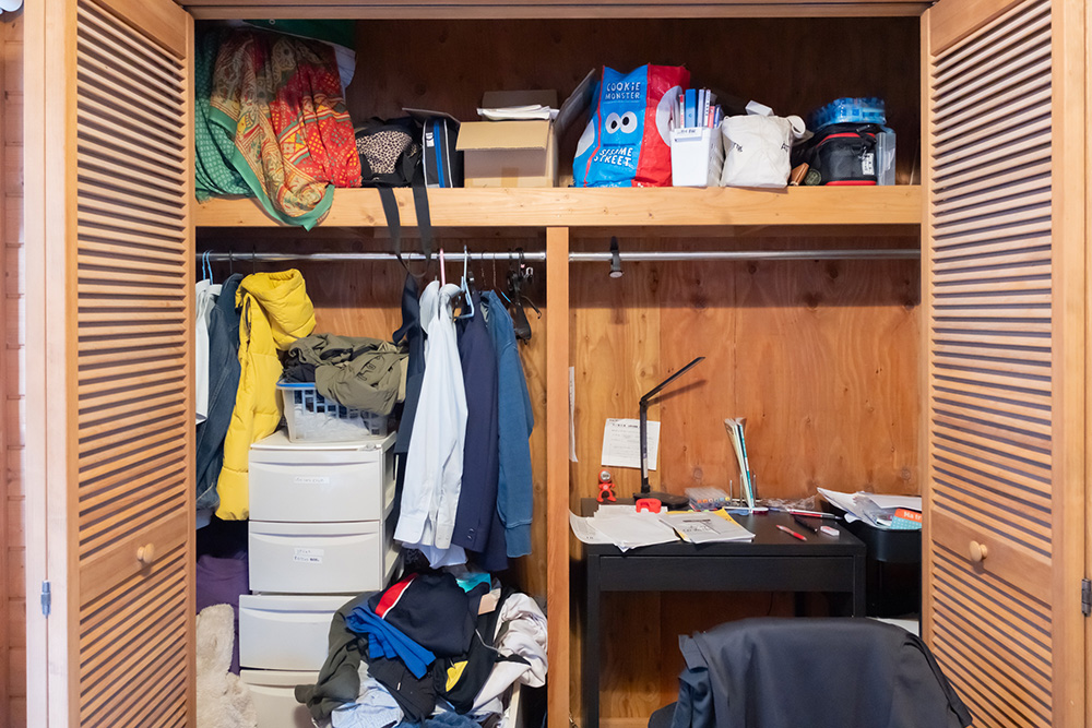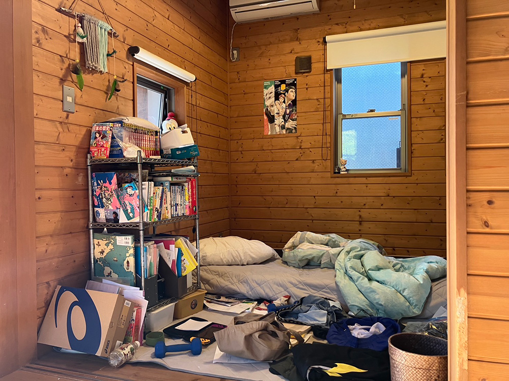 部屋にはすのこベッドと小さなシェルフだけ。学習机はクローゼットの中に設置されていました。持ち物自体はさほど多くありませんが、狭いスペースは足の踏み場もない状態……。