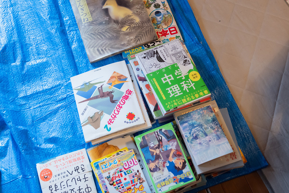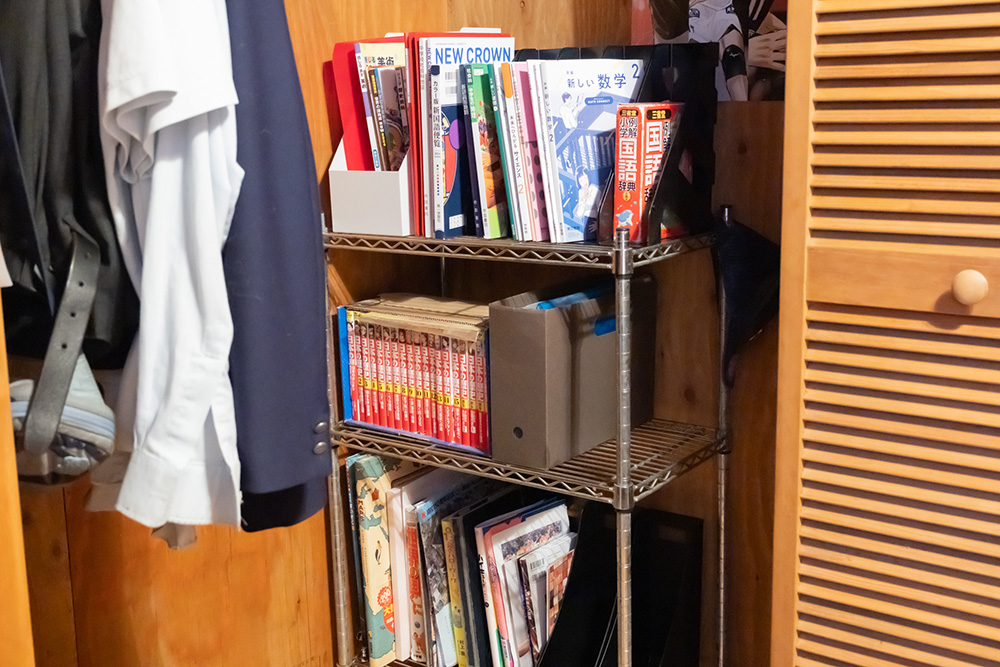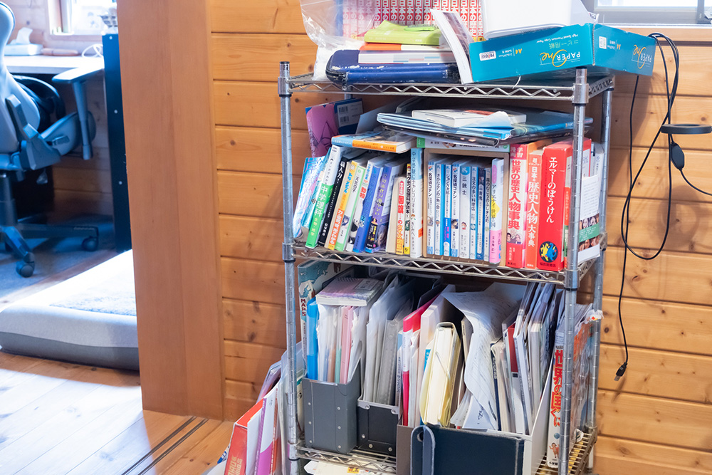 スチールラックには、中学校に進学したタイミングで設置された書籍類がそのままに。さっそく、すべてを部屋の横にあるホールスペースで仕分けを開始します。