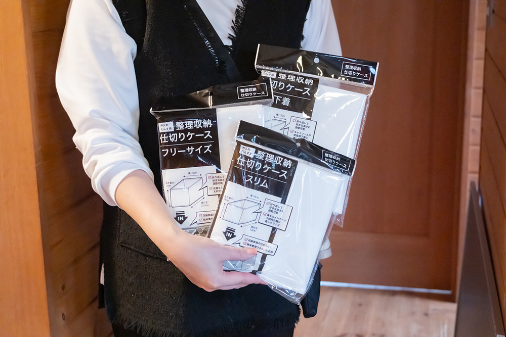 不織布でできたセリアの仕切りケースは、折り曲げることで高さを自由に変更できるので便利。引き出しの中の大きな空間を、仕切って使います。