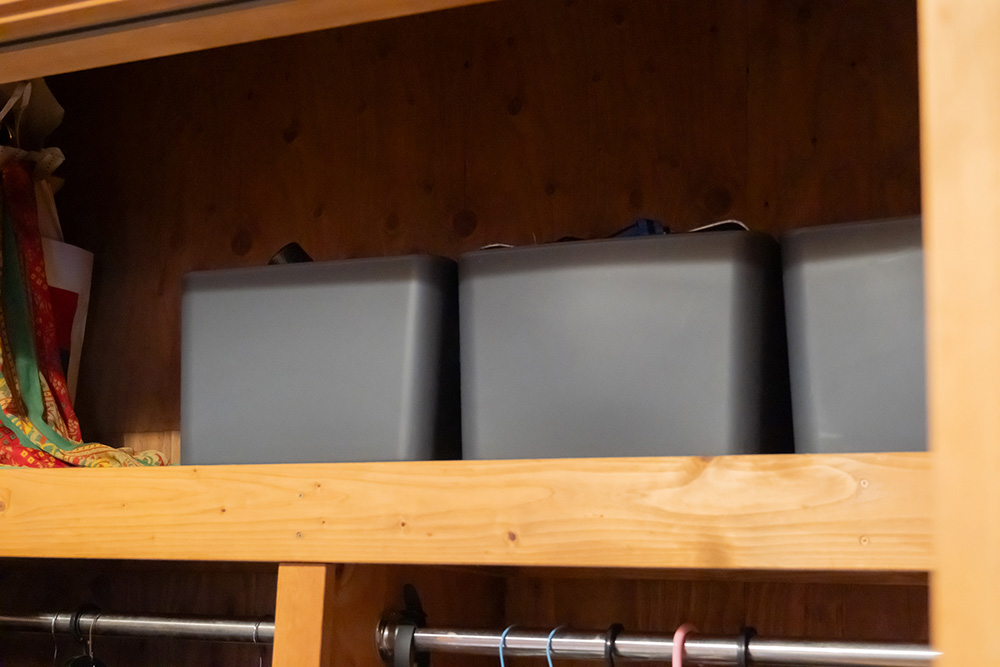 クローゼットの左半分は、衣装ケース+衣類。平日は制服、休日も部活で運動着を着て出かけることが多いそうで、私服の衣類はあまり量がありません。上段には家族のモノが入った段ボールや旅行用品が置いてあります。