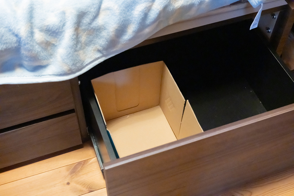 今回新規で投入した引き出し付きベッドの下のスペースも、コンパクトな部屋では絶対に見過ごせないスペース。右側の引き出しには、使用頻度が高い学校で使う運動着を入れることに決めました。