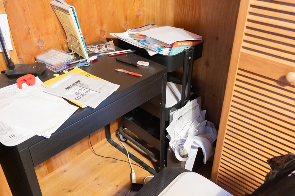 クローゼットの右側、扉の中に学習スペースが作られています。おこもり感と、隠れ家風・男のロマンはありますが、使いやすいかと言われると……? 机の右側には、「IKEA」のキャスター付きワゴンが置いてありますが、一度も移動させたことがないそうで、ほとんど機能していません。