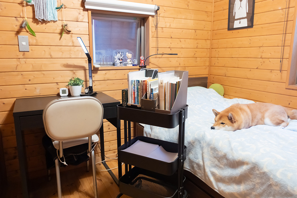 快適になった部屋を、満足そうに見回すSくん。ワンコも居心地良さそうに、さっそく新しいベッドに陣取りました。