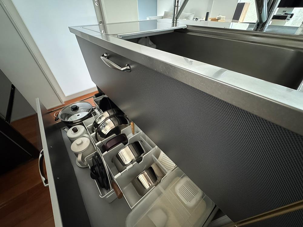「大事なのは、このやり方は私には合わないのだと認めて、代わりにできる方法を探すこと。プロの意見やインフルエンサーの情報を鵜呑みにしないことなんです。ちなみに整理収納のセオリーでは、キッチンではフライパンをコンロ下、鍋をシンク下に収納するのが合理的だと言われていますが、わが家ではどちらもシンク下。シンクで洗った後すぐにしまいたいと考えているから、収納場所を分ける必要がないのです。使うときより片づけるときにラクしたい、という自分の気持ちに合わせて、収納場所を決めました」