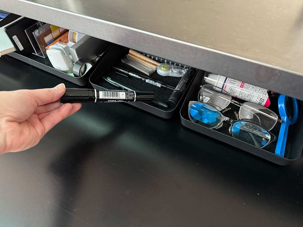 「面倒にならずにモノを元に戻せたらそれでいい、と思っています。私は基本的に、きちんとした収納よりラクさを優先します。特に使用頻度の高いはさみやペン、毎日飲む薬などは必要なときすぐ手に取れるよう、トレーに置くだけ収納。ふたつきボックスに入れたり、引き出しの奥にしまったりすると、取り出すのが面倒になり、元に戻さなくなってしまうからです」