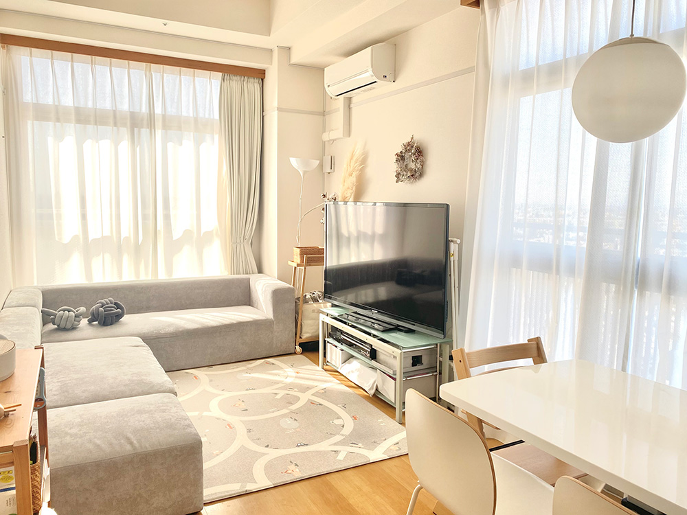 米山さん宅では、娘さんが0歳の頃からこどもアイテムをリビングにまとめて収納。柔らかい素材のボックスにお気に入りおもちゃだけを入れる状態からスタートしました。
