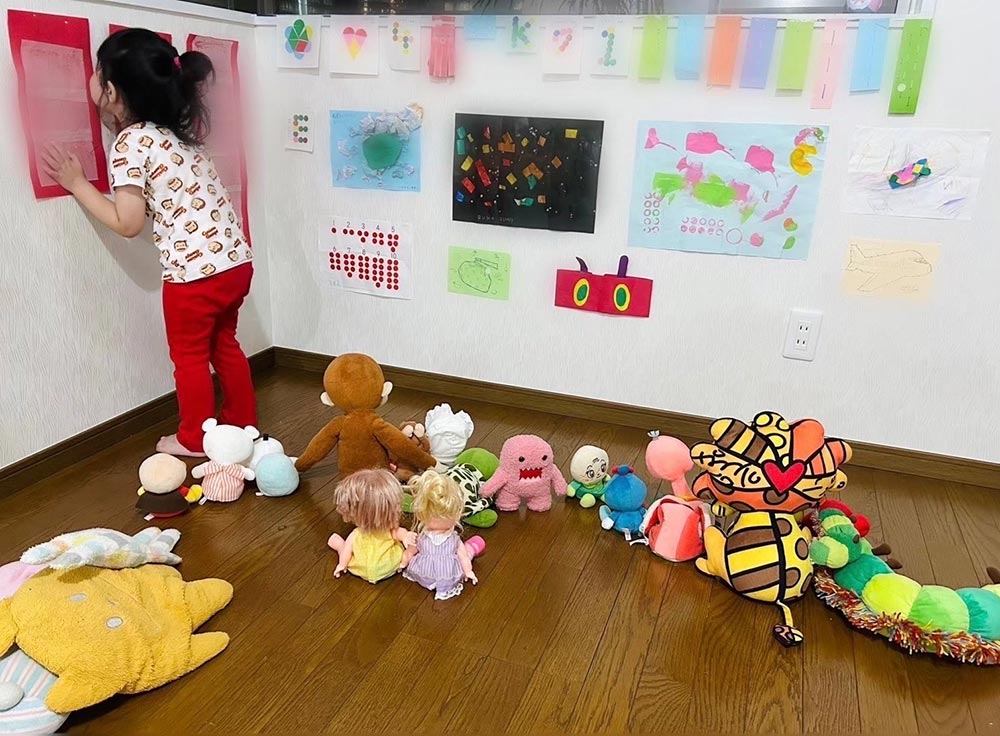「こどもは絵や⼯作など、たくさんの作品を持ち帰ってきますよね。どんどんたまっていきます。でも、全ては残してあげられないので、気に入ってる自信作や厳選した作品などを一旦、壁に飾ってバブ子美術館として開催し、ぬいぐるみをお客さんにしてごっこ遊びをしながら作品を愛でています。娘も嬉しそうに話してくれます。そしてまたしばらく溜まったら、『次のを飾ろうか?』と⾔うと、『うん』と納得する。それで、⼿放しやすくなる。飾る事によって満足するんですね。自己肯定感も上がり、遊びながらより片付けやすくなります」