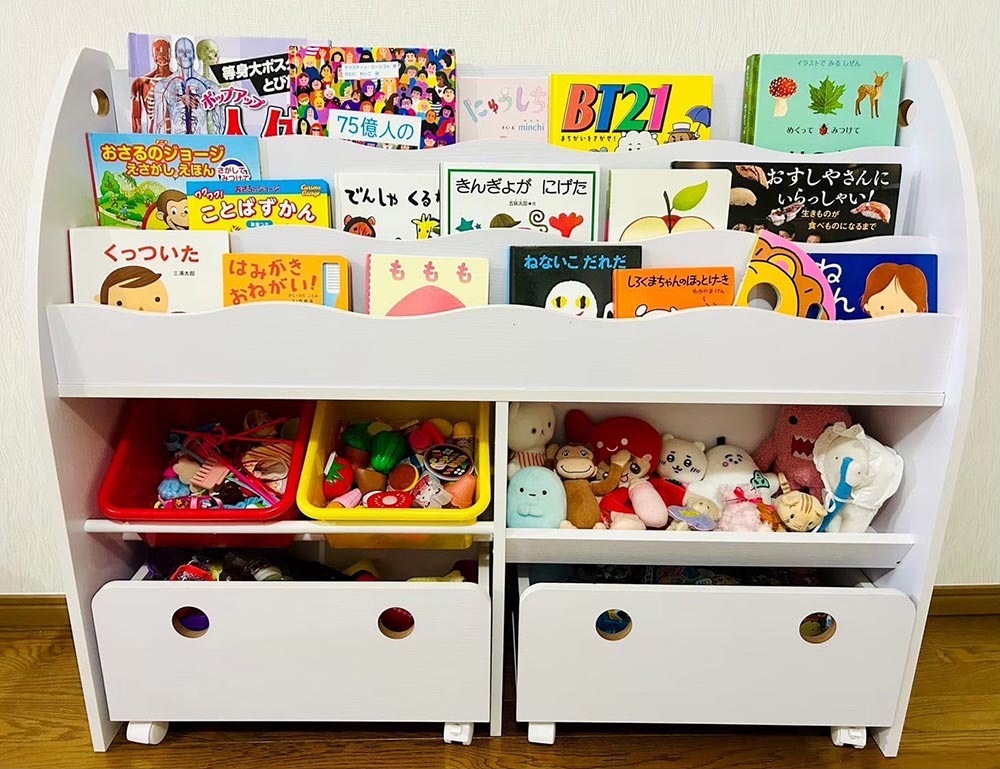 「こどもとの⽚づけで私が⼼がけているのは、なるべく『こども⽬線』に⽴つこと。収納やワゴンの⾼さも、本⼈が⽚づけやすい⾼さにしています。⾃分で⽚づけると達成感があるみたいですね。本棚も、きっちり詰まっていたら取り出しにくいので、子どもでも出し入れしやすい7割収納の本棚にしています」