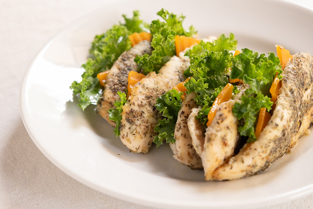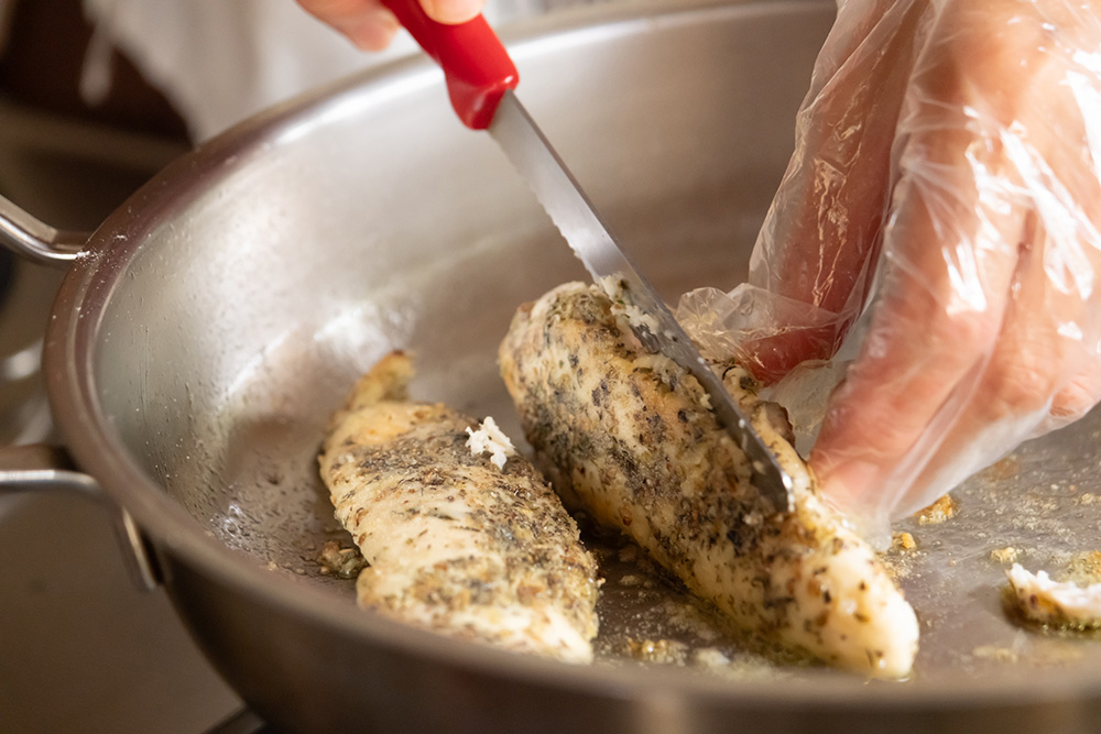 鶏ささみはパサつき防止と味付けのため、ブライン液に漬けこみます。ドライハーブをまぶし、米粉をつけて焼きます。そのまま食べてもおいしいですが、焼きあがったささみムニエルに切り込みを入れ、葉野菜やチーズをサンドしたり、マスタードなどのソースを塗ったりするのもおすすめ。
