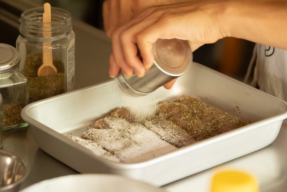 1. ブライン液に浸けておいたささみの水分をさっと拭き取り、ドライハーブをまぶし両面に米粉をふりかける。