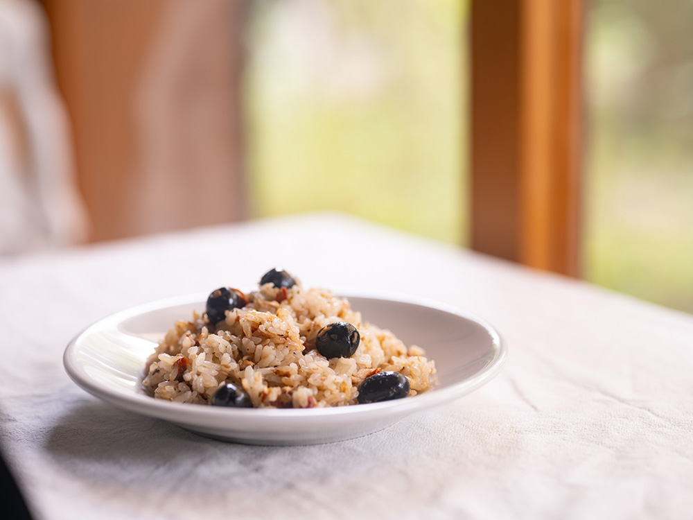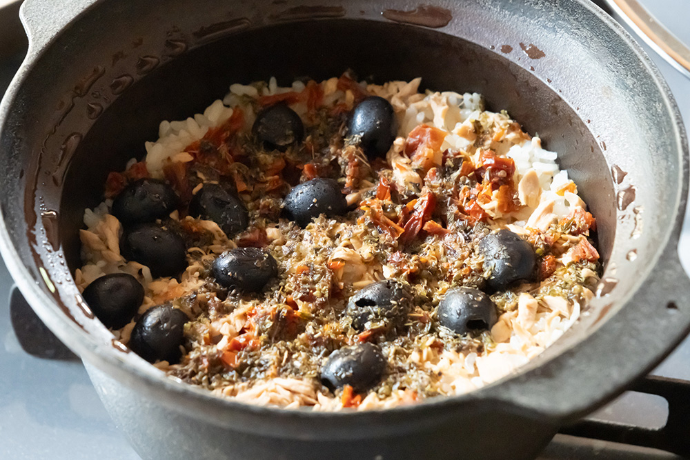 オリーブがごろごろ入っておいしい。炊飯の水加減は通常のご飯炊きと同じです。