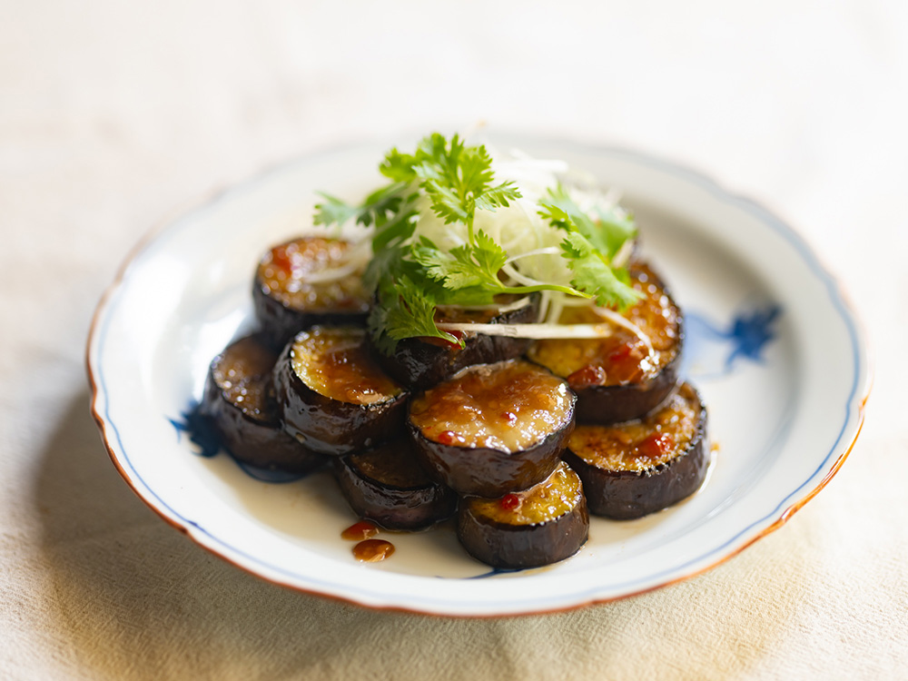 こんがりと焼き目をつけたナスに、スイートチリ味噌だれを合わせるだけ。ズッキーニやかぼちゃなど、ほかの野菜でもおいしい。