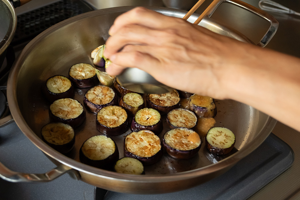 3. 2のフライパンにスイートチリ味噌だれを入れ、火にかけながらナスと合わせる。水分が飛び、とろみと照りが出てきたら完成。