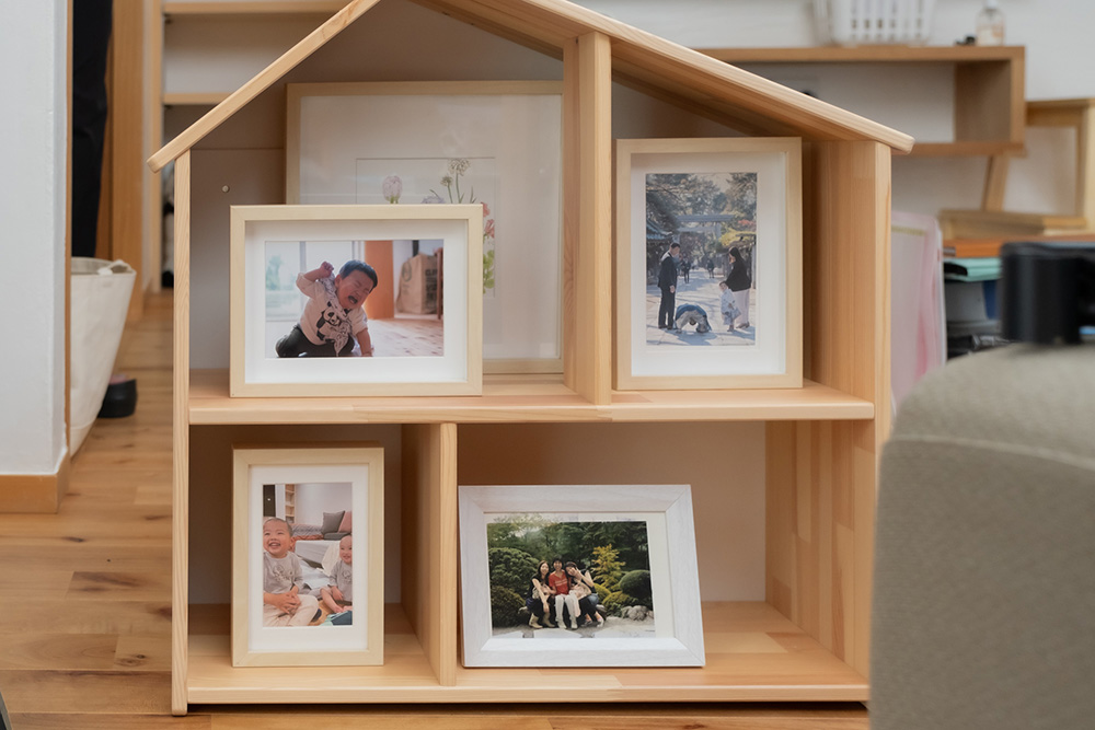 大きいオープン棚に、小さい飾りをちまちま置いてもあまり映えません。もともとここにあった「IKEA」のドールハウスにフレームを複数入れこんで、存在感のあるインテリアにしました。大きなスペースには、大きなオブジェでメリハリが出ます。