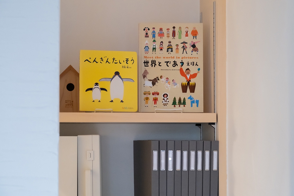右サイドの最上段には、お気に入りの絵本を飾って。