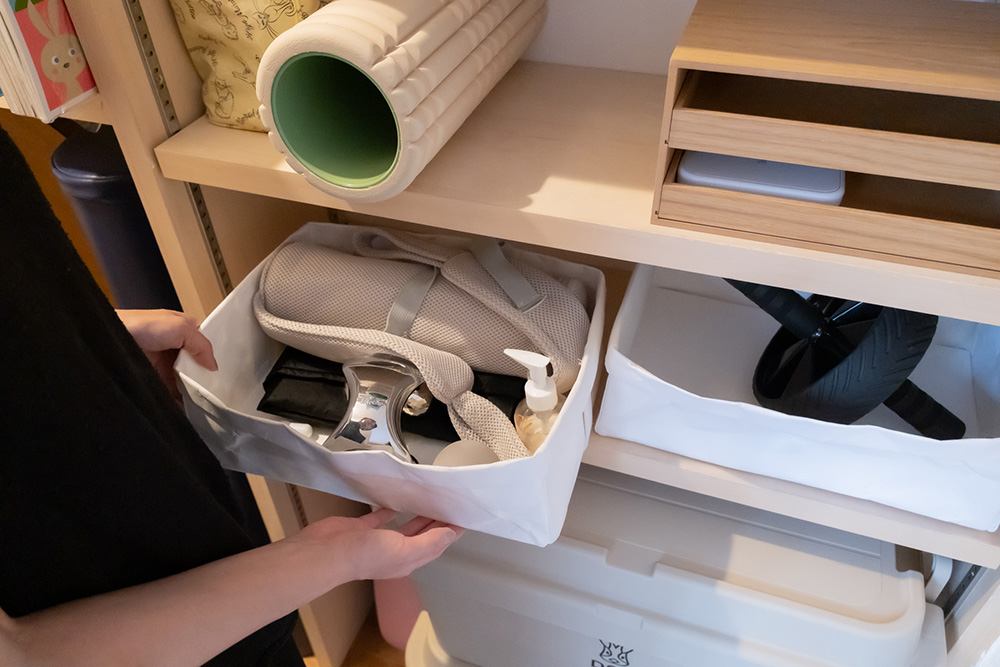 落ちないようにと紙のボックスに入れた腹筋ローラーも、そのまま置かれていたときより「大切に使われているモノ」という雰囲気を醸し出しました。適当に置かれていないからです。大事そうに見えるモノたちが、価値の高そうな収納を作り出します。