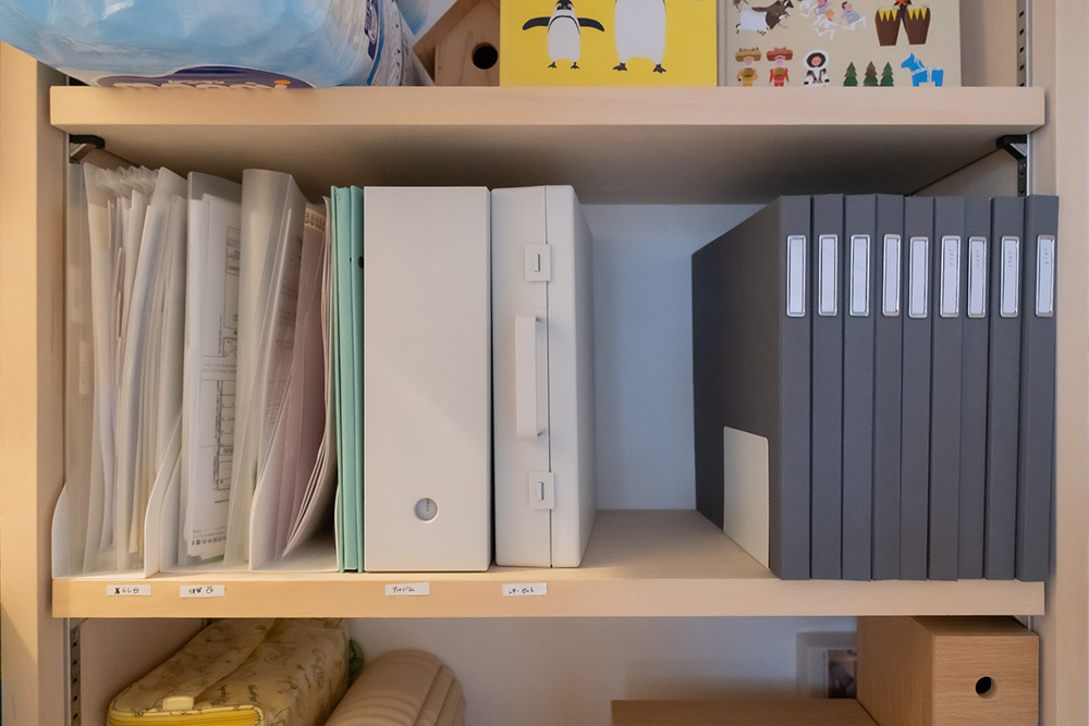同じ高さの白いファイルボックスを並べる。同じグレーのアルバムを「リビングから見える場所」に整列させる。