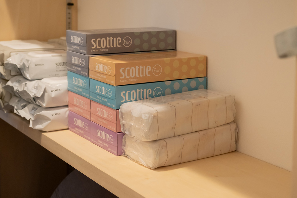 ティッシュなどの紙ものストックは、外袋から出して中身だけを積むことで、取りやすさだけでなく整然とした見た目も手にすることができました。