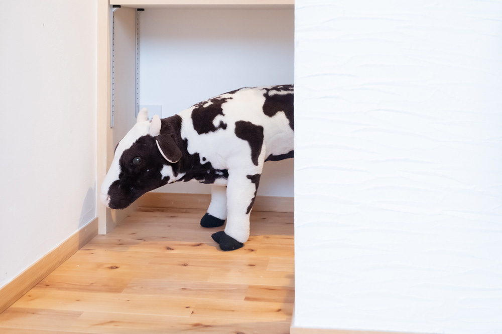 こちら、中村家で愛されてきた牛の形のオットマン「さちこ」。こどもたちも乗って楽しんできた愛着あるモノです。オブジェとしても場になじんで可愛らしかったので、あえて見えるところに置きました。木、ラタンのかご、しっくいの白壁にマッチしています。