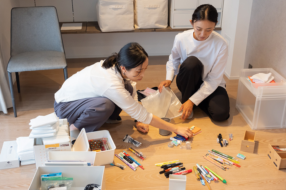 リビングの収納を整理している一幕で、時間がかかったのが、文房具の整理。小学生と保育園児のいる小竹さんのおうちには、お土産でもらう筆記用具や学校に持っていく用の文房具などが、どんどん増えて管理が難しくなっていました。