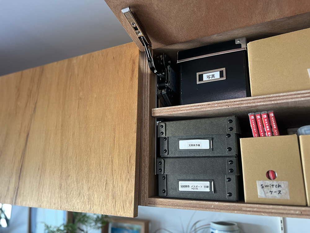 大人の文房具ストックは、作業場でもあるダイニングテーブル近くの吊戸棚に。ボックスにまとめています。