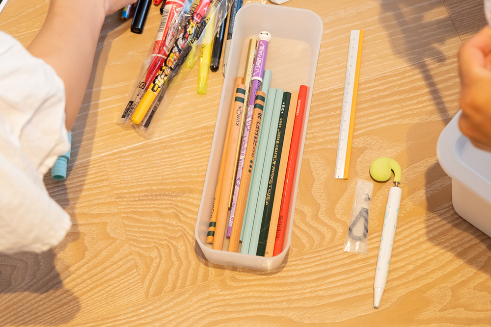 ストックの中でもすぐに出番の来る「小学校用の鉛筆ストック」は、取りやすいトレーにまとめてボックスへ。